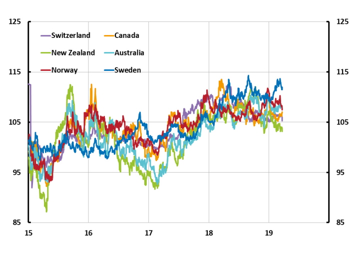 - Global factors seem also to have played a part. The currencies of other small economies with substantial foreign trade are showing a similar pattern to the krona (see Figure). One explanation may be the uncertainty about the prospects for global trade created by, for example, Brexit and the trade conflict between the United States and China.