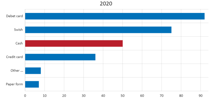 During the coronavirus pandemic, the Swedish people have chosen to pay more often by card or Swish, instead of in cash. Even elderly people have started to use Swish more during the pandemic. The proportion of contactless payments in shops has also increased in conjunction with the limit for contactless payments being raised from 200 kronor to 400 kronor in April.