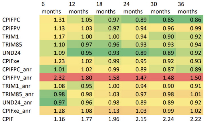 Table 2. Relative ability to forecast future annual percentage changes in the CPIF for each inflation measure at different forecast horizons for the period 2018-2023.