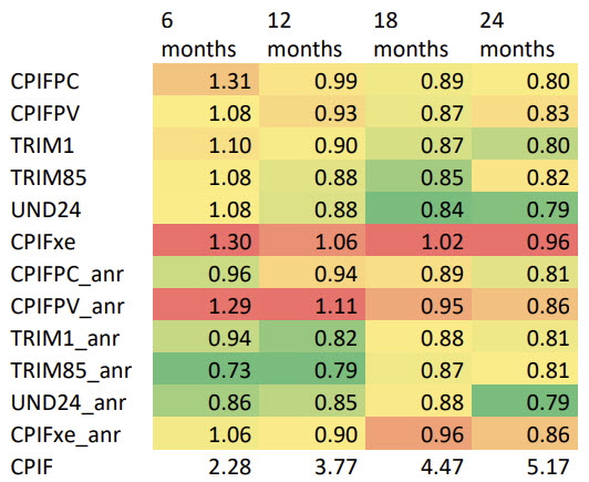 Note. The figures for the CPIF refer to the RMSE (Root Mean Squared Error) for the annual percentage change in the CPIF. Other figures refer to the relative RMSE to the RMSE of the CPIF. Thus, the figure of 1.15 for the CPIFPC at the 6-month horizon means that the RMSE is 1.15*1.12=1.29. The estimation period is 2000-2023. The measures with the suffix _anr are calculated from monthly changes in seasonally adjusted data. The results were then annualised and a 3-month moving average was calculated.