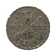 Frånsidan visar de korslagda "dalapilarna". I den övre vinkeln en krona och i den undre årtalet 1794. På ömse sidor texten D: 9. / IULI. Längs randen samma bård som på åtsidan.
